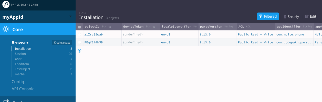 Push notifications: Because of the implicit security issues with allowing push notifications to be sent through Android or iOS directly to other devices, this feature is disabled. Note that for open source Parse, you must implement pre-defined code written in JavaScript that can be called by the clients to execute, otherwise known as Parse Cloud.