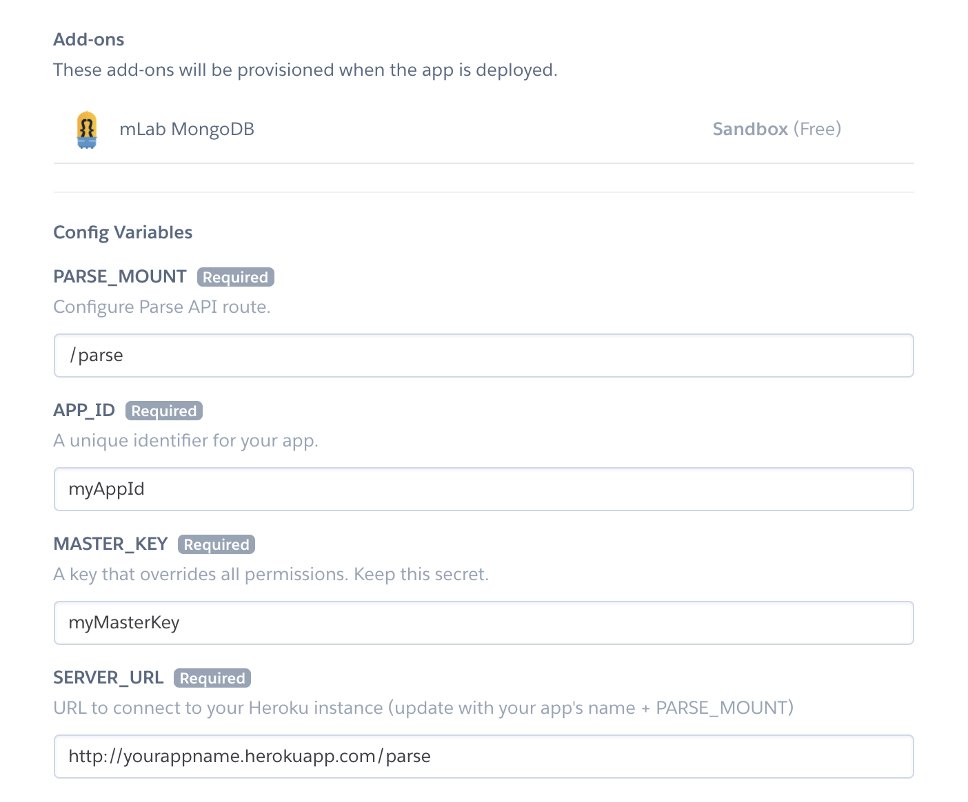 MASTER_KEYto be the master key used to read/write all data. You will only use this key if you intend to setup the Parse Dashboard. - Set